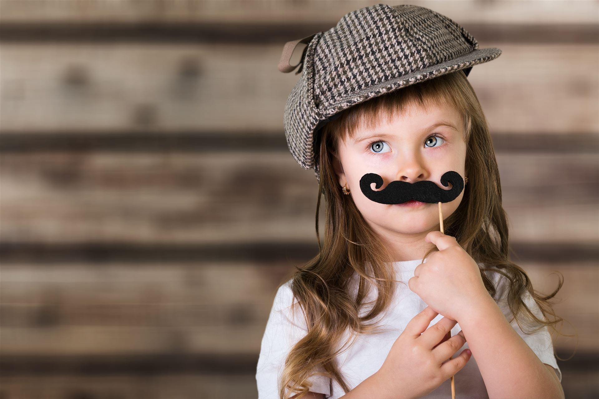 Komplettes Accessoires-Set mit witzigen Brillen, verrückten Perücken und coolen Requisiten in einer stylischen Holztruhe.